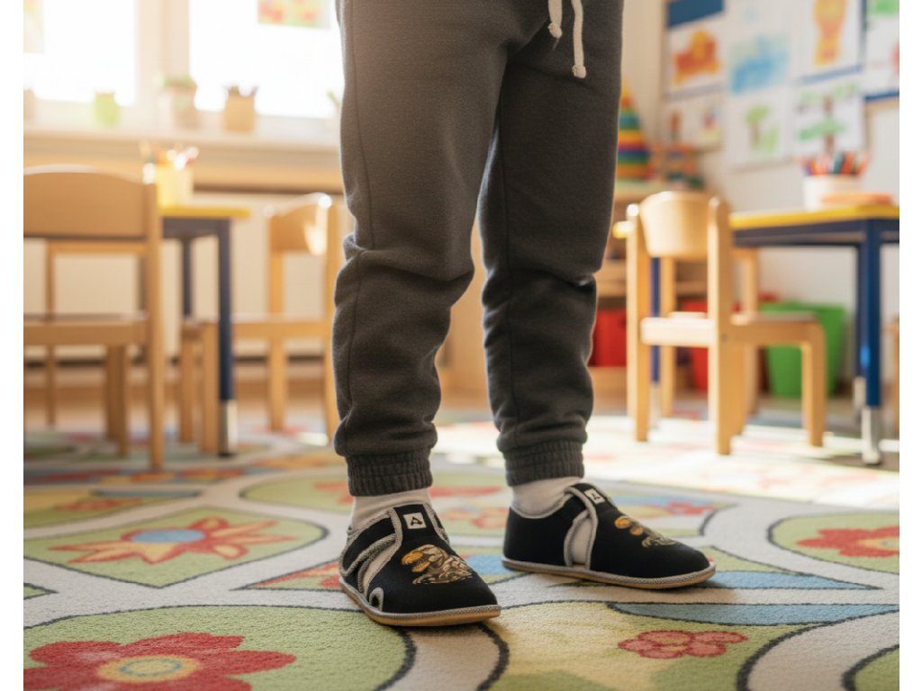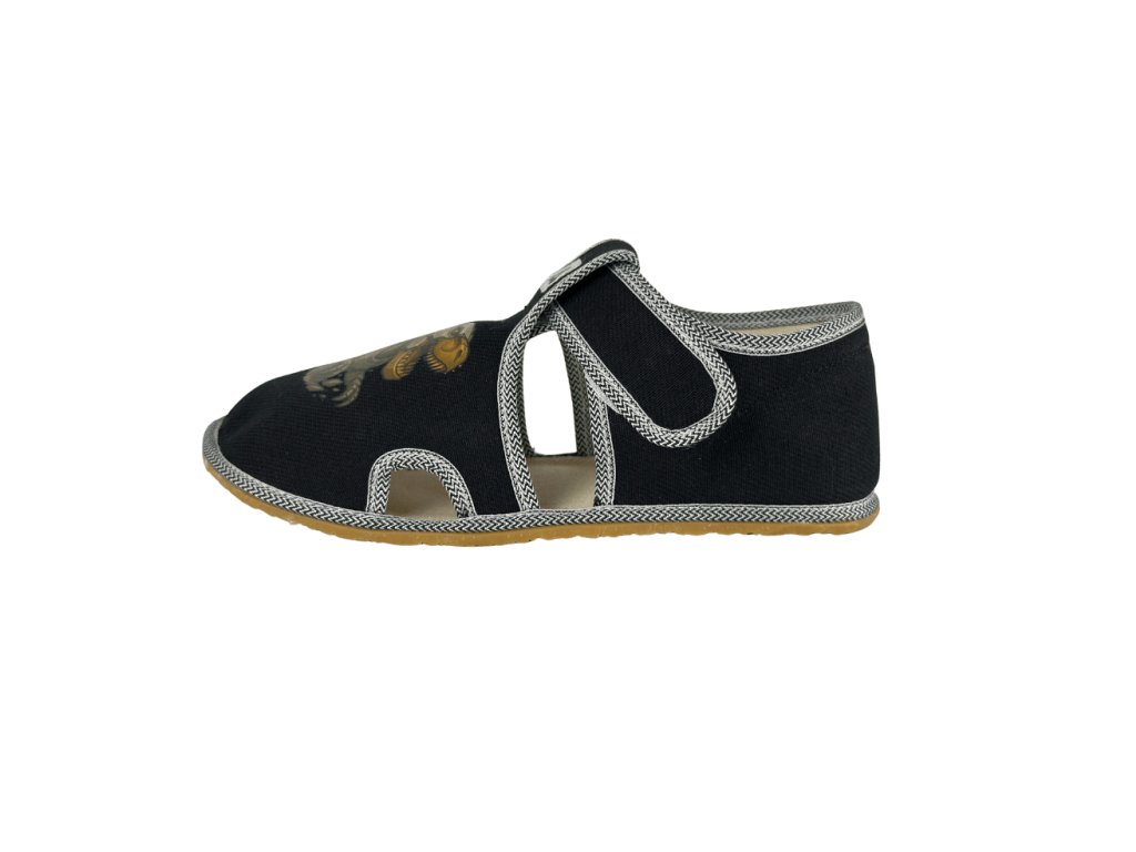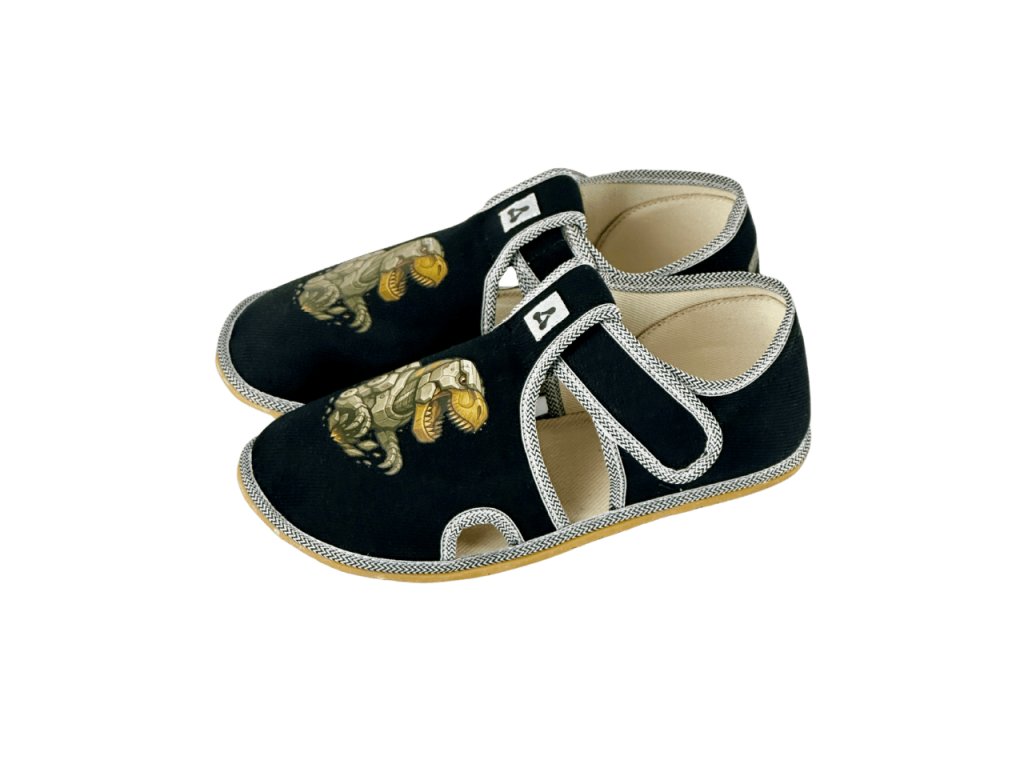 ANTAL RASCAL Mech-Rex sú štýlové barefoot papučky navrhnuté pre maximálne pohodlie a zdravý vývoj detských nôh. Vďaka anatomicky tvarovanej špičke poskytujú dostatok priestoru pre prsty, čím podporujú prirodzený pohyb a prácu svalov chodidla. Tenká a vysoko ohybná podrážka simuluje chôdzu naboso, zatiaľ čo uzavretá špička chráni prsty pri hrách v interiéri. Čierny textilný zvršok s originálnym motívom mechanického dinosaura Mech-Rex zaujme každého malého objaviteľa. Papučky sú ideálnou voľbou do škôlky, školy alebo na domáce nosenie pre deti, ktoré vyžadujú voľnosť pohybu.