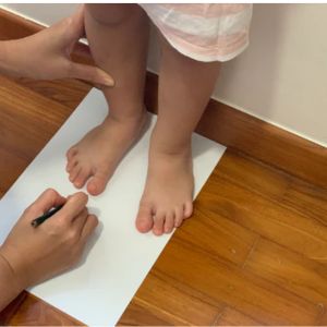 - Postavte dieťa na rovný povrch s papierom pod nohami.
