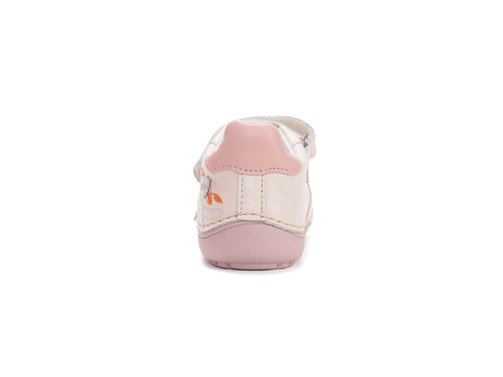 D.D.STEP 063 sú štýlové dievčenské barefoot topánky ideálne na prechodné obdobie. Vďaka anatomicky tvarovanej širokej špičke poskytujú dostatok priestoru pre prirodzený pohyb prstov a zdravý vývoj detského chodidla. Zvršok je vyrobený z kvalitnej bielej kože zdobenej jemnou kvetinovou výšivkou. Topánky disponujú veľmi ohybnou a ľahkou podrážkou, ktorá neobmedzuje v pohybe. Vnútorná kožená stielka a podšívka zabezpečujú maximálny komfort a priedušnosť počas celodenného nosenia. Zapínanie na dva suché zipsy umožňuje rýchle obutie a dobrú reguláciu okolo priehlavku.