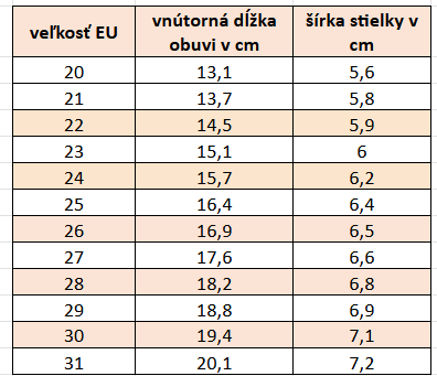 Ak dieťatku nameriate nohu 14 cm, pripočítajte nadmerok 0,7 – 1 cm = 14,7 – 15 cm → vyberiete veľkosť 23.