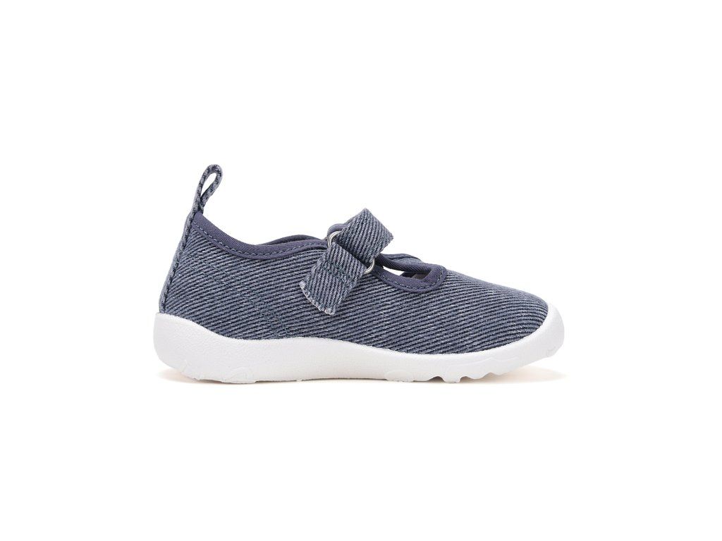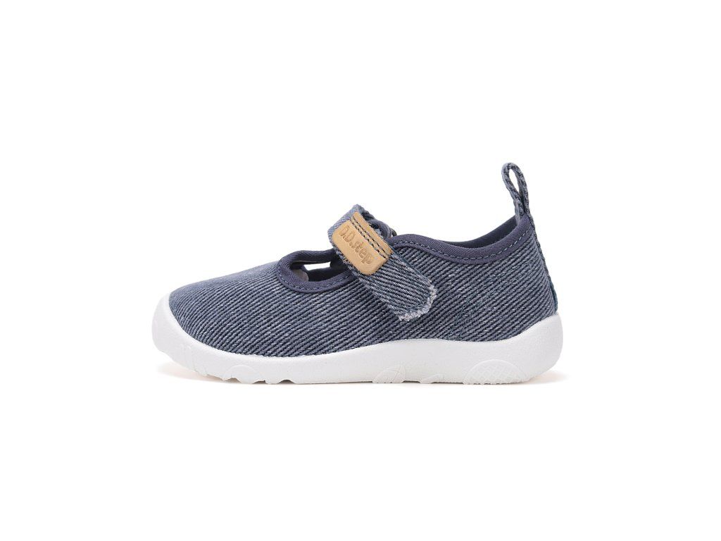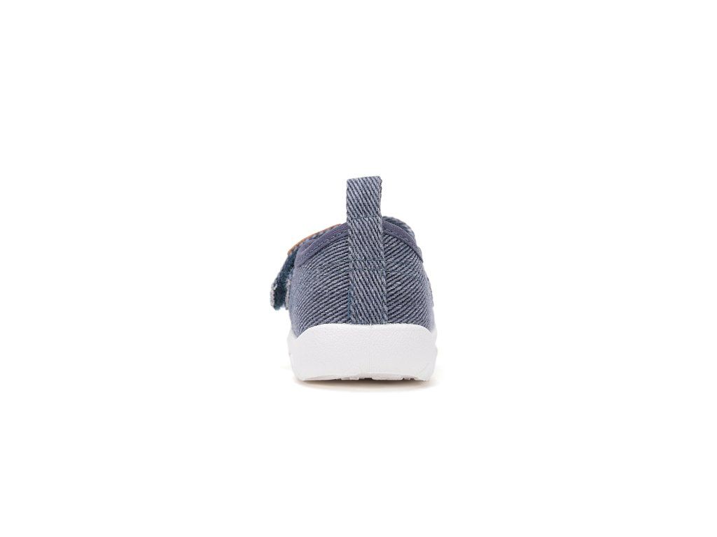 Bočný pohľad na modrý textilný zvršok s praktickým zapínaním na suchý zips