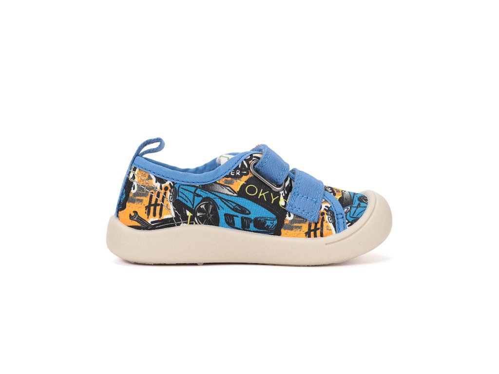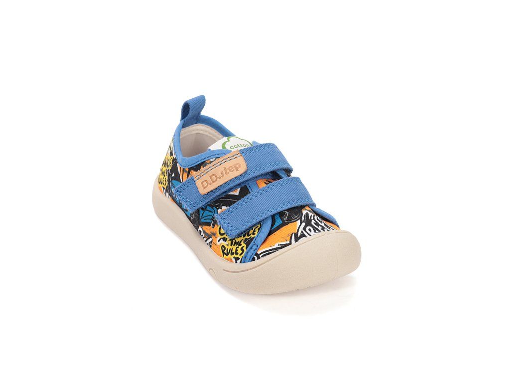 Tieto chlapčenské plátenky od renomovanej značky D.D.STEP z modelovej rady 100 sú ideálnou voľbou pre aktívne deti. Vyznačujú sa veselým dizajnom s graffiti potlačou v dynamickej kombinácii modrej a oranžovej farby. Topánky sú vyrobené z kvalitných a priedušných textilných materiálov, ktoré zabezpečujú maximálny komfort počas celého dňa. Gumová podrážka je dostatočne ohybná a zároveň inteligentne tvarovaná tak, aby chránila špičku pred okopaním. Praktické zapínanie na dva suché zipsy umožňuje deťom rýchle obúvanie a zaisťuje dobrú fixáciu nohy v topánke pri každom dobrodružstve.