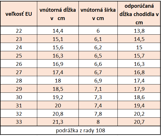 Uvedená dĺžka je celková dĺžka stielky. Odmerajte dieťatku nôžku, pripočítajte k nej nadmerok 0,7 - 1cm a následne v tabuľke vyhľadajte veľkosť ktorá vyhovuje tejto dĺžke.