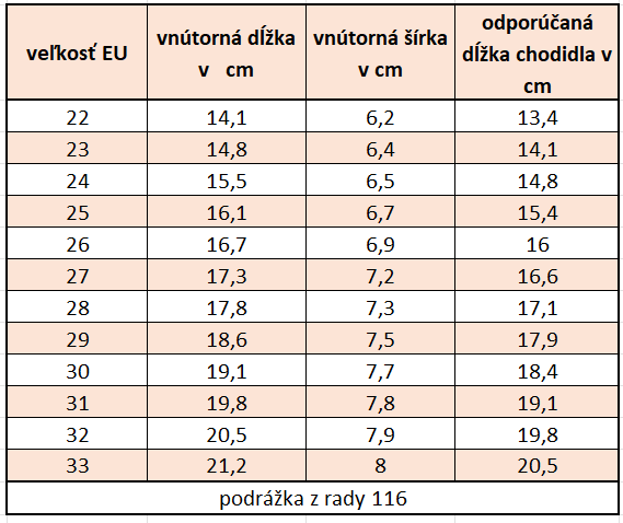 Uvedená dĺžka je celková dĺžka stielky. Odmerajte dieťatku nôžku, pripočítajte k nej nadmerok 0,7 - 1cm a následne v tabuľke vyhľadajte veľkosť ktorá vyhovuje tejto dĺžke.