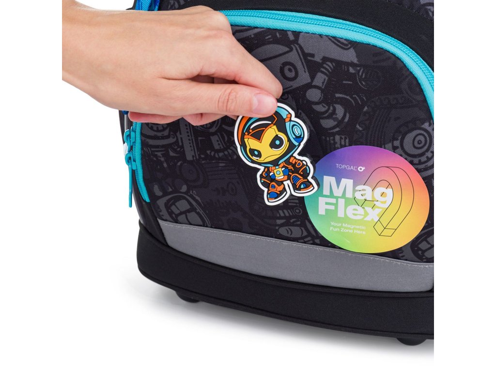 Technický motív s robotmi, ozubenými kolieskami a mechanickými detailmi zaujme všetkých malých objaviteľov, ktorí milujú stroje a múdre vynálezy. Tmavší dizajn v kombinácii s tyrkysovými detailmi pôsobí moderne a nadčasovo. Súčasťou aktovky je aj pevne držiaci magnet v tvare malého robota, ktorý dotvára celkový vzhľad a dodáva mu hravý nádych. Vymeniteľné magnety ZMAG si môžete zakúpiť aj samostatne v našej ponuke.