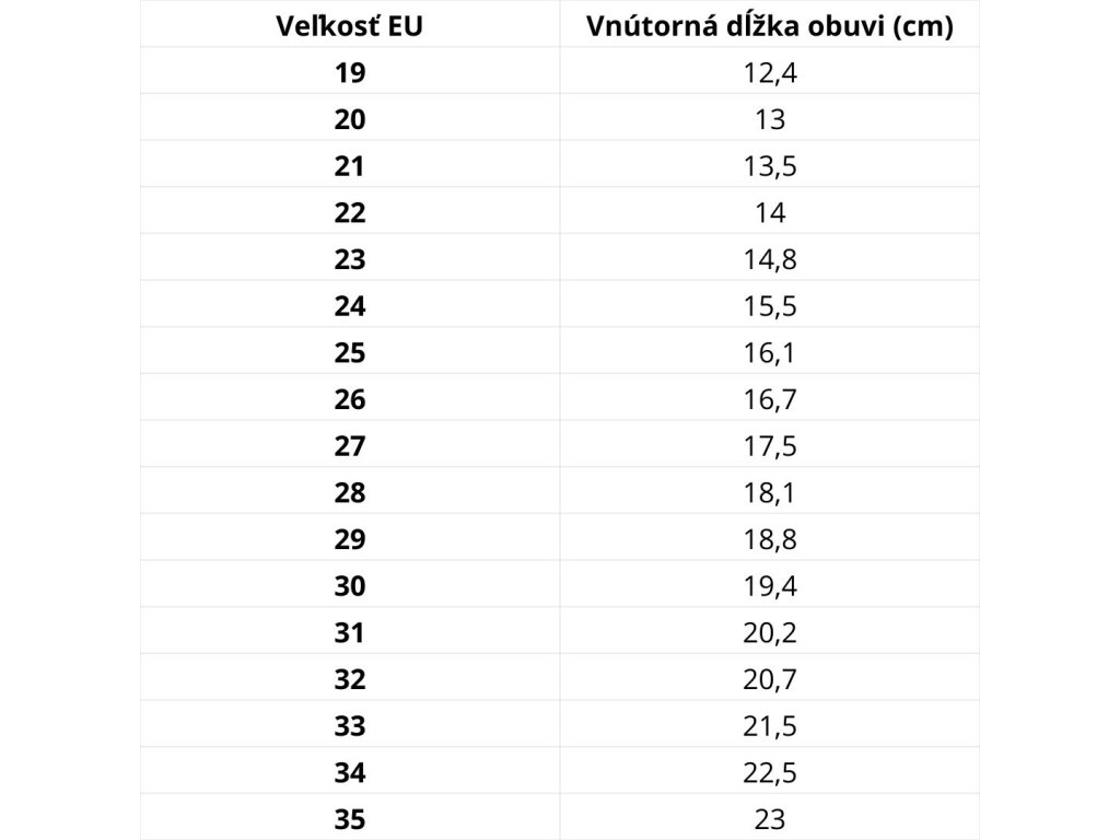 K dĺžke odmeraného chodidla pripočítajte nadmerok 10 až 12 mm a podľa výsledku vyberte veľkosť z priloženej tabuľky.