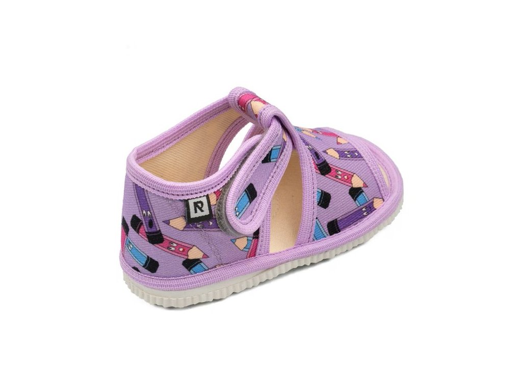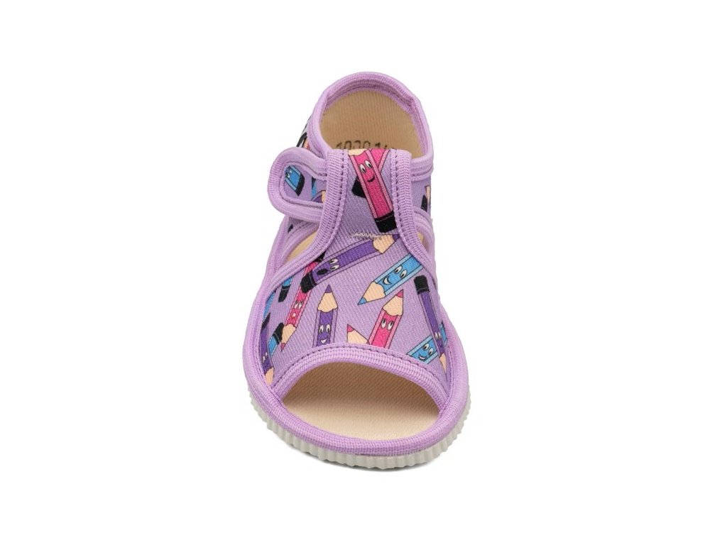 Ľahké a priedušné detské papuče sandálkového strihu sú ideálne ako prezúvky do škôlky, školy aj na domáce nosenie. Otvorená špička poskytuje prstom dostatok priestoru a zapínanie na suchý zips umožňuje rýchle a jednoduché obúvanie. Mäkký bavlnený textil je príjemný na nosenie a papučky sa dobre prispôsobia detskej nožičke. Vnútorná stielka s penovou výplňou v strednej časti chodidla zvyšuje pohodlie pri chôdzi. Podrážka je vhodná pre normálnu až mierne širšiu nôžku.