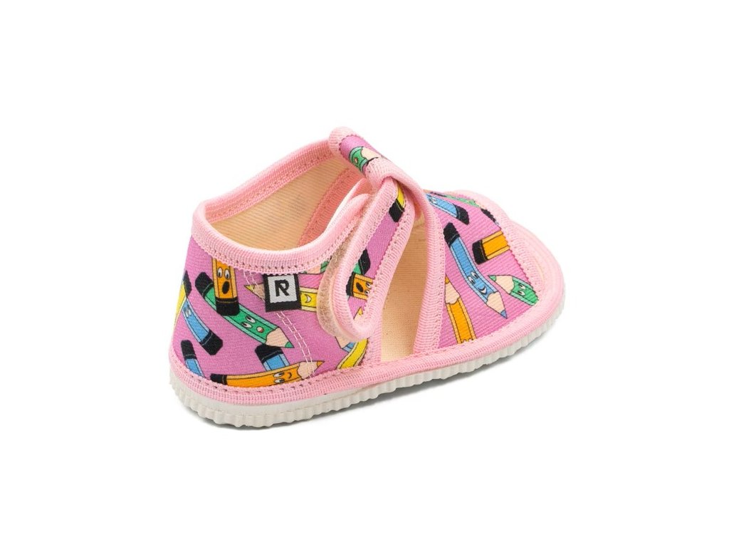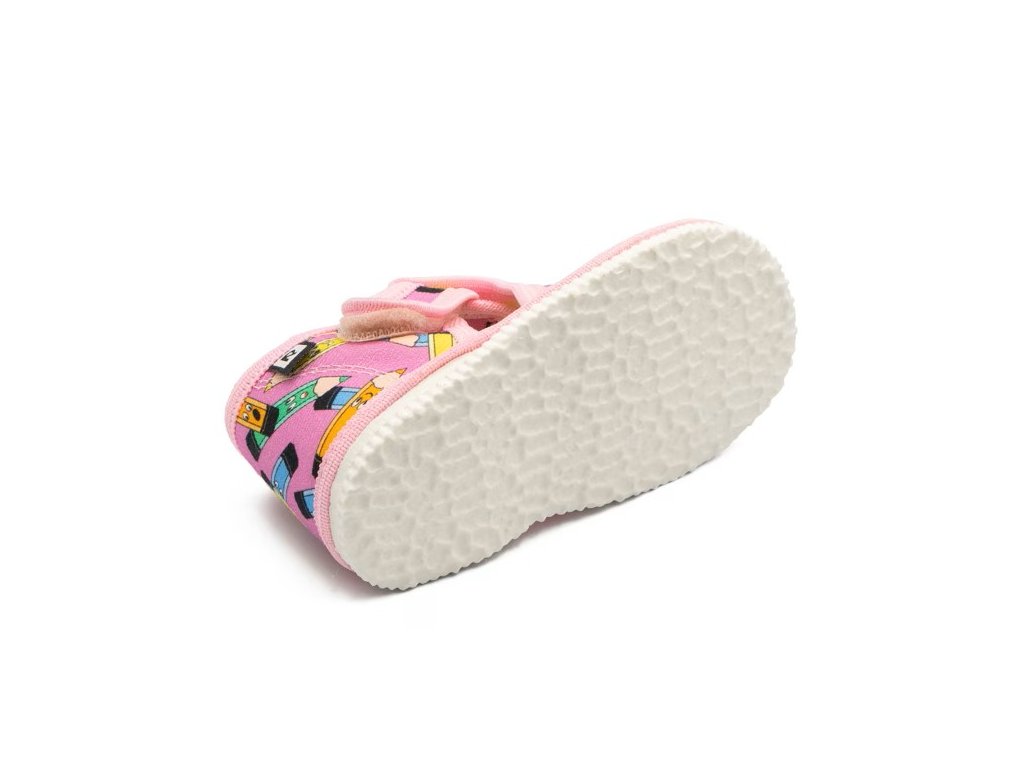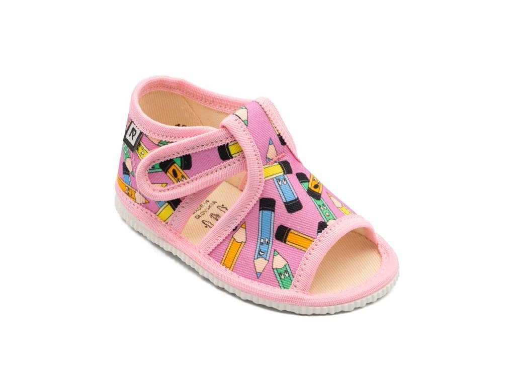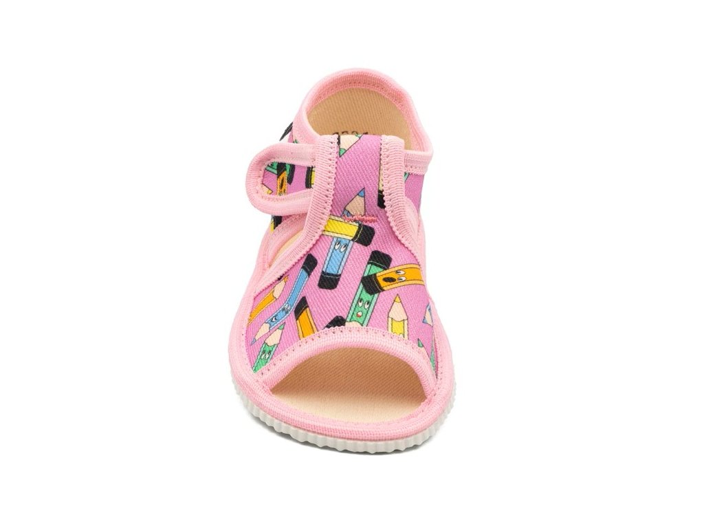 Ľahké a priedušné detské papuče sandálkového strihu sú ideálne ako prezúvky do škôlky, školy aj na domáce nosenie. Otvorená špička poskytuje prstom dostatok priestoru a zapínanie na suchý zips umožňuje rýchle a jednoduché obúvanie. Mäkký bavlnený textil je príjemný na nosenie a papučky sa dobre prispôsobia detskej nožičke. Vnútorná stielka s penovou výplňou v strednej časti chodidla zvyšuje pohodlie pri chôdzi. Podrážka je vhodná pre normálnu až mierne širšiu nôžku.