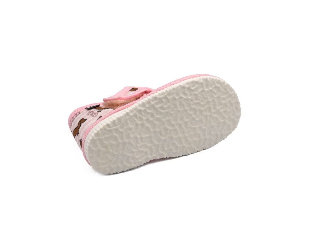 Vo vnútri sa nachádza pohodlná stielka s penovou výplňou v strednej časti chodidla, ktorá zvyšuje komfort pri chôdzi a jemne podporuje zdravý vývoj nohy. Zapínanie na suchý zips umožňuje jednoduché a rýchle obúvanie, pričom papuče sa dajú dobre prispôsobiť aj vyššiemu priehlavku.
