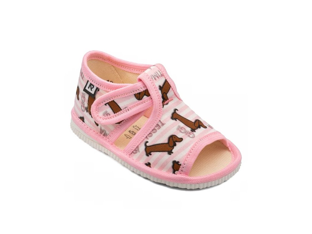 Ľahké a priedušné detské papuče sandálkového strihu sú ideálne ako prezúvky do škôlky, školy aj na domáce nosenie. Otvorená špička poskytuje prstom dostatok priestoru a zapínanie na suchý zips umožňuje rýchle a jednoduché obúvanie. Mäkký bavlnený textil je príjemný na nosenie a papučky sa dobre prispôsobia detskej nožičke. Vnútorná stielka s penovou výplňou v strednej časti chodidla zvyšuje pohodlie pri chôdzi. Podrážka je vhodná pre normálnu až mierne širšiu nôžku.