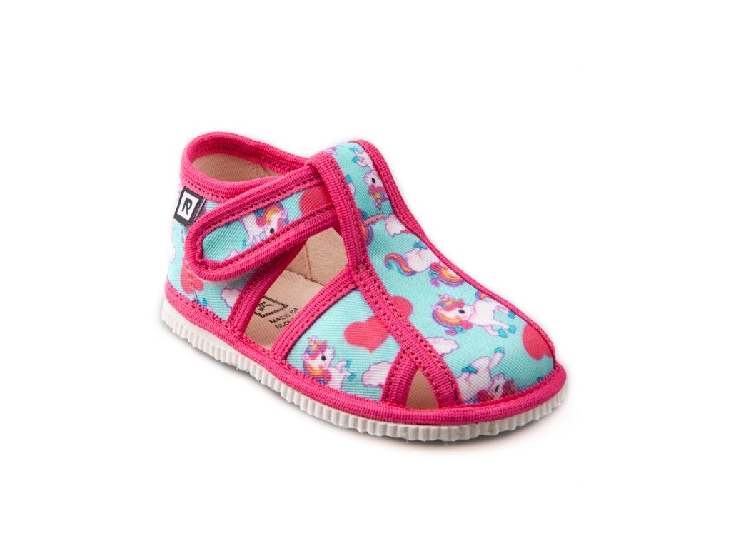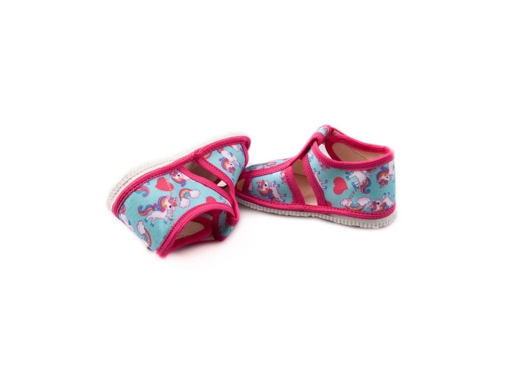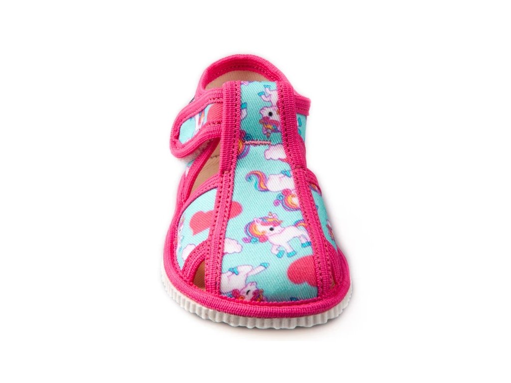 Tvar špičky rešpektuje dominantný detský palček, čo zabezpečuje dostatok miesta pre prsty a prirodzené rozloženie chodidla pri pohybe. Papučky sú určené na interiérové nosenie ako prezúvková obuv a sú vhodné do škôlky, školy aj na domáce použitie.