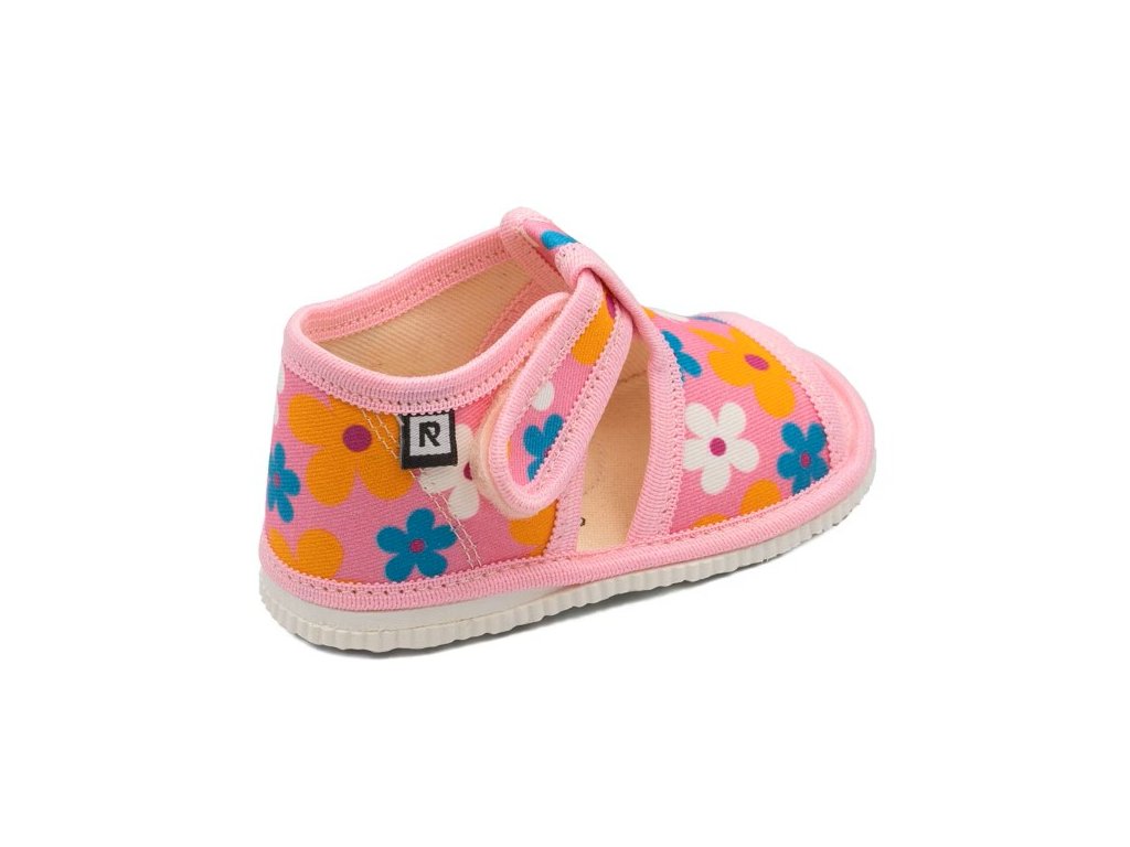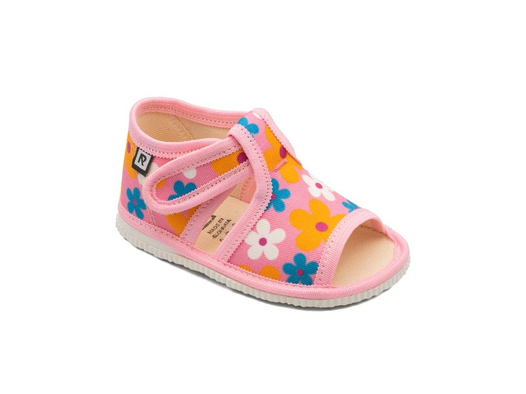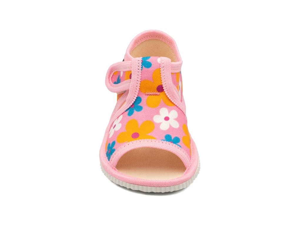 Ľahké a priedušné detské papuče sandálkového strihu sú ideálne ako prezúvky do škôlky, školy aj na domáce nosenie. Otvorená špička poskytuje prstom dostatok priestoru a zapínanie na suchý zips umožňuje rýchle a jednoduché obúvanie. Mäkký bavlnený textil je príjemný na nosenie a papučky sa dobre prispôsobia detskej nožičke. Vnútorná stielka s penovou výplňou v strednej časti chodidla zvyšuje pohodlie pri chôdzi. Podrážka je vhodná pre normálnu až mierne širšiu nôžku.