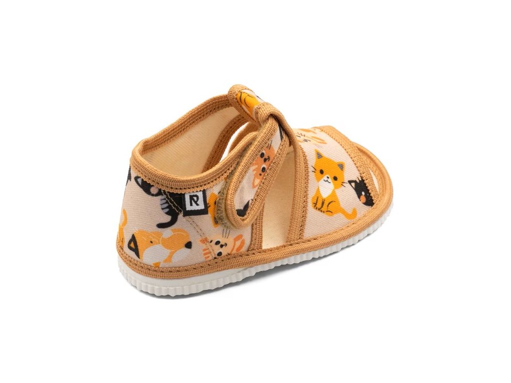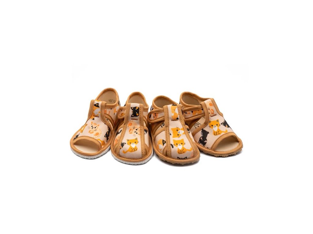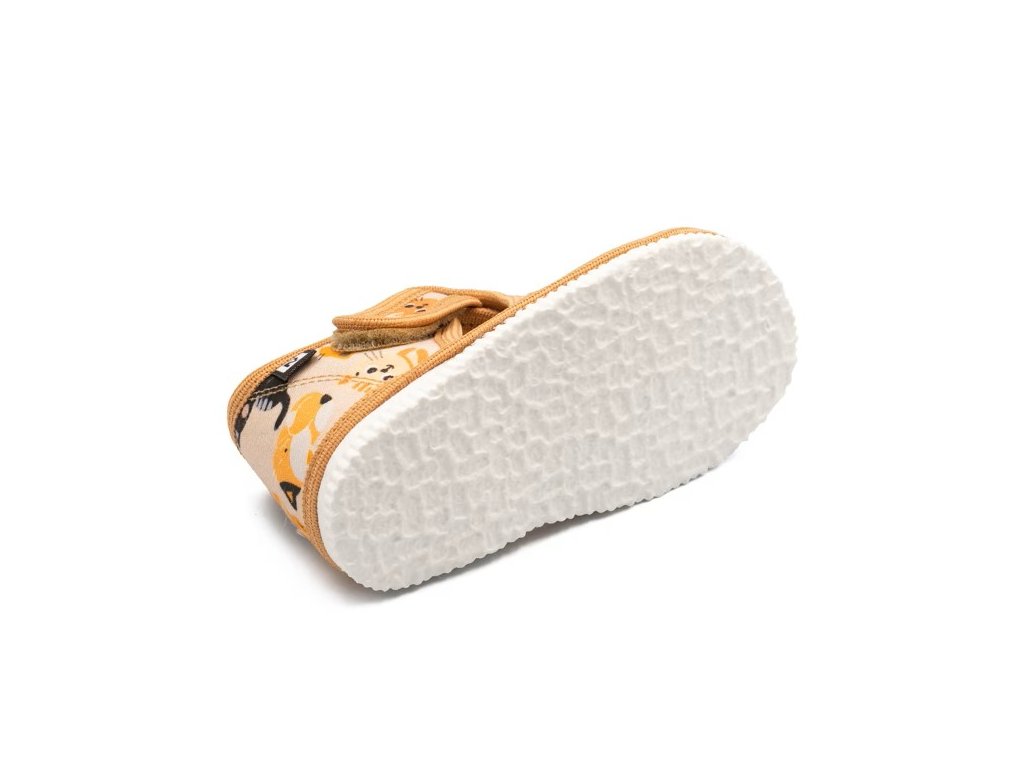 Ľahké a priedušné detské papuče sandálkového strihu sú ideálne ako prezúvky do škôlky, školy aj na domáce nosenie. Otvorená špička poskytuje prstom dostatok priestoru a zapínanie na suchý zips umožňuje rýchle a jednoduché obúvanie. Mäkký bavlnený textil je príjemný na nosenie a papučky sa dobre prispôsobia detskej nožičke. Vnútorná stielka s penovou výplňou v strednej časti chodidla zvyšuje pohodlie pri chôdzi. Podrážka je vhodná pre normálnu až mierne širšiu nôžku.