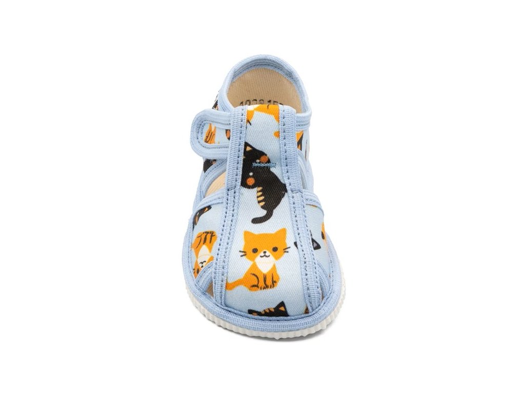 Tvar špičky rešpektuje dominantný detský palček, čo zabezpečuje dostatok miesta pre prsty a prirodzené rozloženie chodidla pri pohybe. Papučky sú určené na interiérové nosenie ako prezúvková obuv a sú vhodné do škôlky, školy aj na domáce použitie.