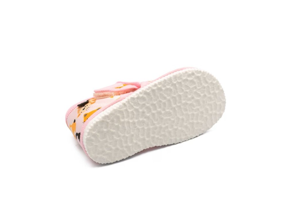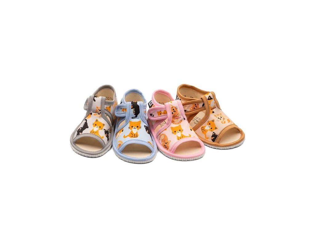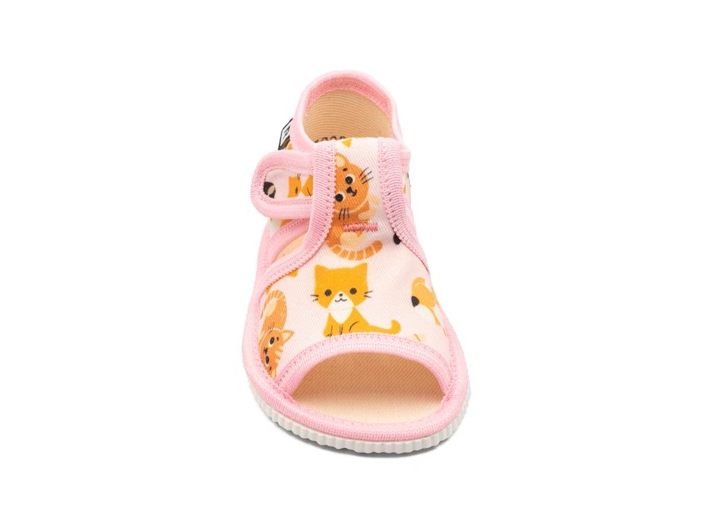 Ľahké a priedušné detské papuče sandálkového strihu sú ideálne ako prezúvky do škôlky, školy aj na domáce nosenie. Otvorená špička poskytuje prstom dostatok priestoru a zapínanie na suchý zips umožňuje rýchle a jednoduché obúvanie. Mäkký bavlnený textil je príjemný na nosenie a papučky sa dobre prispôsobia detskej nožičke. Vnútorná stielka s penovou výplňou v strednej časti chodidla zvyšuje pohodlie pri chôdzi. Podrážka je vhodná pre normálnu až mierne širšiu nôžku.