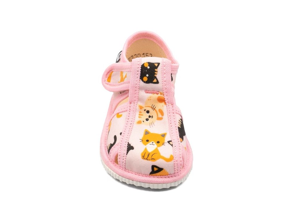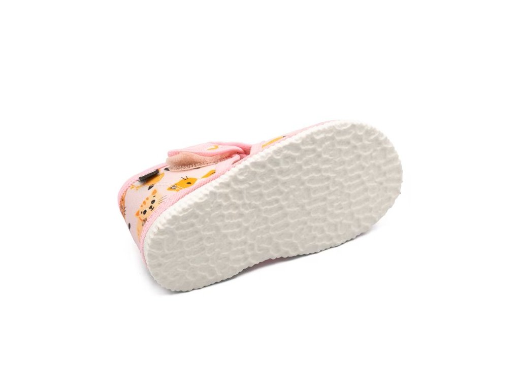 Tvar špičky rešpektuje dominantný detský palček, čo zabezpečuje dostatok miesta pre prsty a prirodzené rozloženie chodidla pri pohybe. Papučky sú určené na interiérové nosenie ako prezúvková obuv a sú vhodné do škôlky, školy aj na domáce použitie.