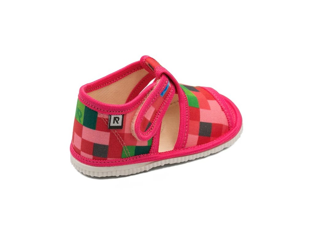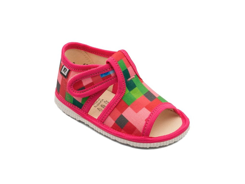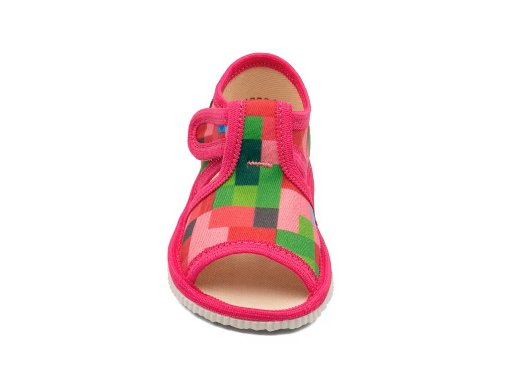 Ľahké a priedušné detské papuče sandálkového strihu sú ideálne ako prezúvky do škôlky, školy aj na domáce nosenie. Otvorená špička poskytuje prstom dostatok priestoru a zapínanie na suchý zips umožňuje rýchle a jednoduché obúvanie. Mäkký bavlnený textil je príjemný na nosenie a papučky sa dobre prispôsobia detskej nožičke. Vnútorná stielka s penovou výplňou v strednej časti chodidla zvyšuje pohodlie pri chôdzi. Podrážka je vhodná pre normálnu až mierne širšiu nôžku.