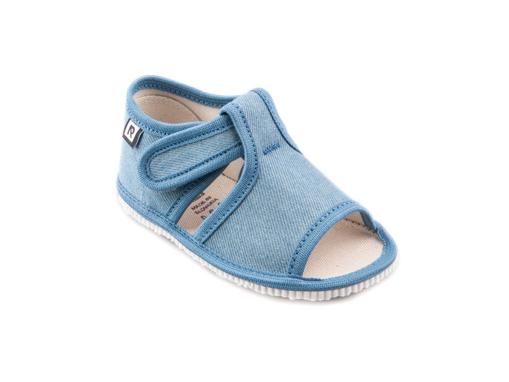 Ľahké a priedušné detské papuče sandálkového strihu sú ideálne ako prezúvky do škôlky, školy aj na domáce nosenie. Otvorená špička poskytuje prstom dostatok priestoru a zapínanie na suchý zips umožňuje rýchle a jednoduché obúvanie. Mäkký bavlnený textil je príjemný na nosenie a papučky sa dobre prispôsobia detskej nožičke. Vnútorná stielka s penovou výplňou v strednej časti chodidla zvyšuje pohodlie pri chôdzi. Podrážka je vhodná pre normálnu až mierne širšiu nôžku.