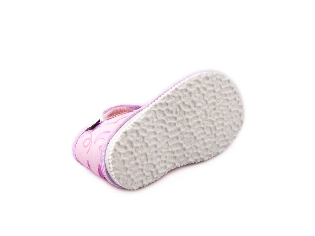 Vo vnútri sa nachádza pohodlná stielka s penovou výplňou v strednej časti chodidla, ktorá zvyšuje komfort pri chôdzi a jemne podporuje zdravý vývoj nohy. Zapínanie na suchý zips umožňuje jednoduché a rýchle obúvanie, pričom papuče sa dajú dobre prispôsobiť aj vyššiemu priehlavku.