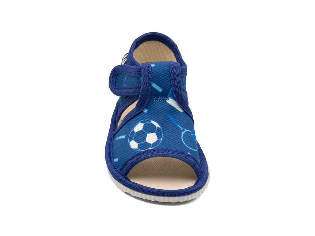 Ľahké a priedušné detské papuče sandálkového strihu sú ideálne ako prezúvky do škôlky, školy aj na domáce nosenie. Otvorená špička poskytuje prstom dostatok priestoru a zapínanie na suchý zips umožňuje rýchle a jednoduché obúvanie. Mäkký bavlnený textil je príjemný na nosenie a papučky sa dobre prispôsobia detskej nožičke. Vnútorná stielka s penovou výplňou v strednej časti chodidla zvyšuje pohodlie pri chôdzi. Podrážka je vhodná pre normálnu až mierne širšiu nôžku.