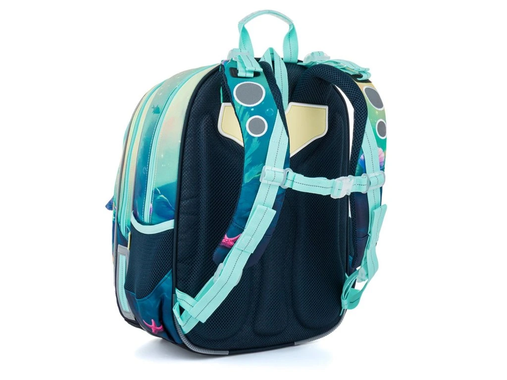 Školní batoh ELLY 26005 je ušitý ve střihu KIMI, který je vhodný pro školačky od 125 cm a bez problémů poslouží od 2. do 5. třídy. Pohádkový motiv mořské víly v jemných tyrkysových a pastelových tónech vnese do každého školního dne kousek fantazie a kouzelného světa pod hladinou.