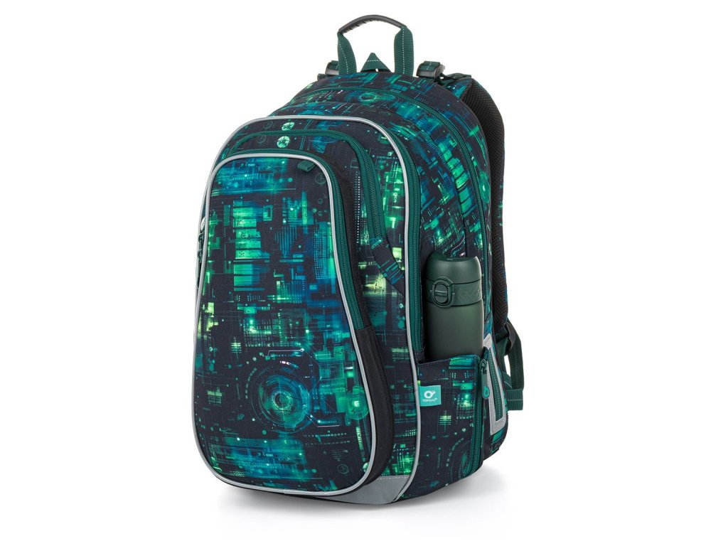 Školská taška LYNN 26019 je dvojkomorový model navrhnutý pre každodenné školské nasadenie. Moderný digitálny motív inšpirovaný technológiami osloví najmä chlapcov, ktorých zaujímajú počítače, hry a futuristický štýl.