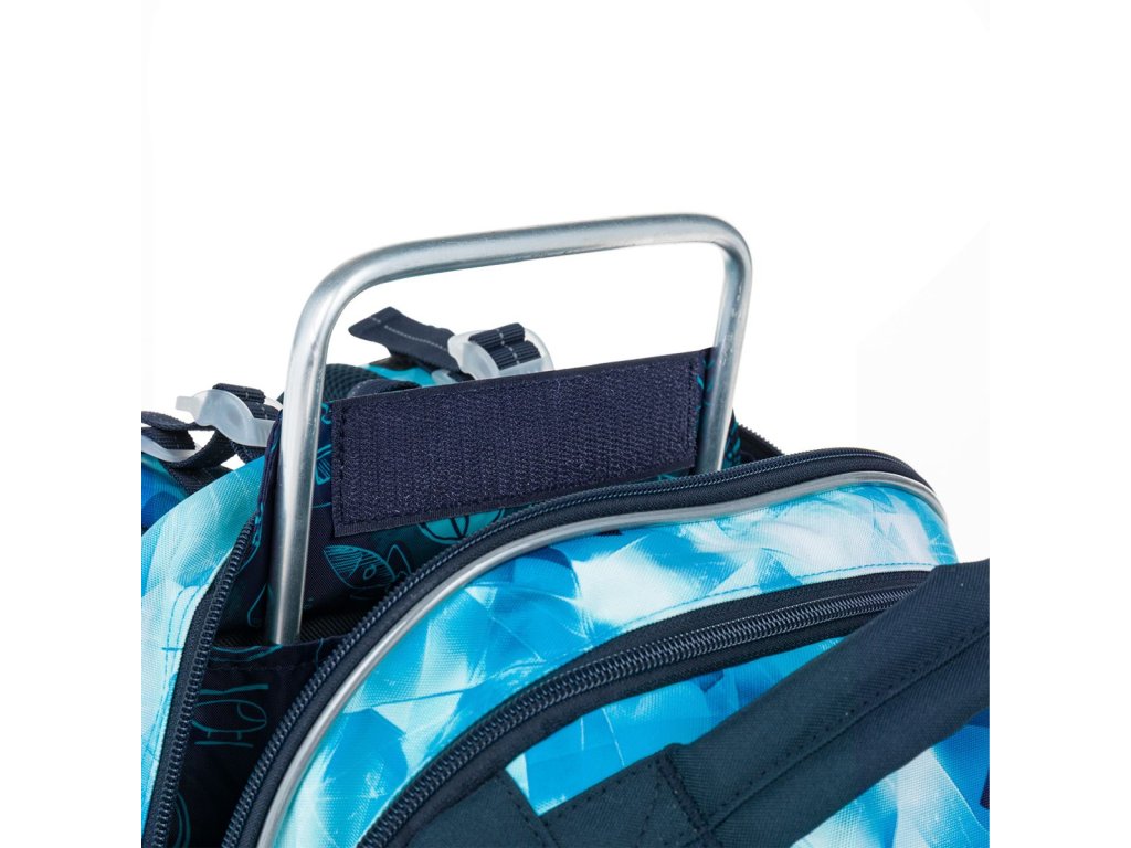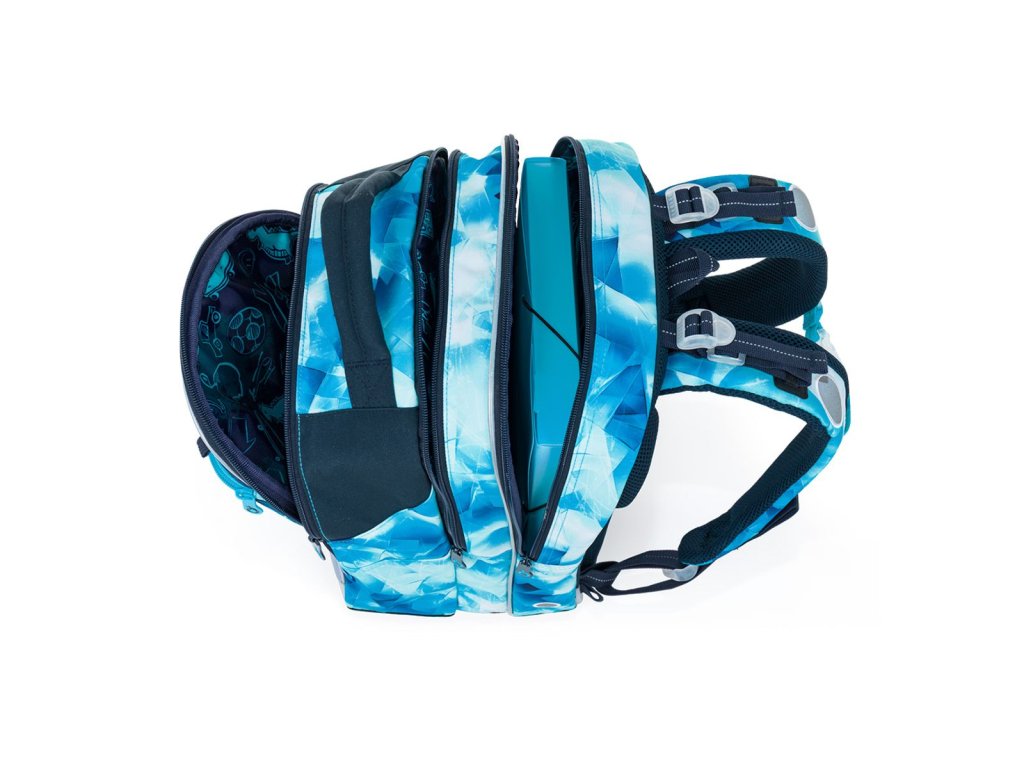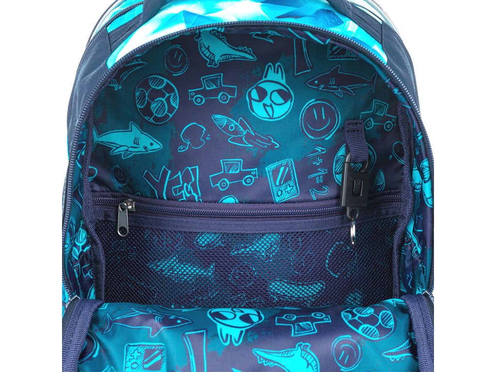 Vnútorný priestor je prakticky rozdelený pre jednoduchú organizáciu školských pomôcok. Do zadnej komory odporúčame uložiť ťažšie učebnice alebo dosky na zošity, predné vrecko je ideálne na ľahšiu výbavu, ako je peračník alebo desiatový box. Samozrejmosťou je odnímateľná karabína na kľúče, ktorá pomôže udržať poriadok v drobnostiach.