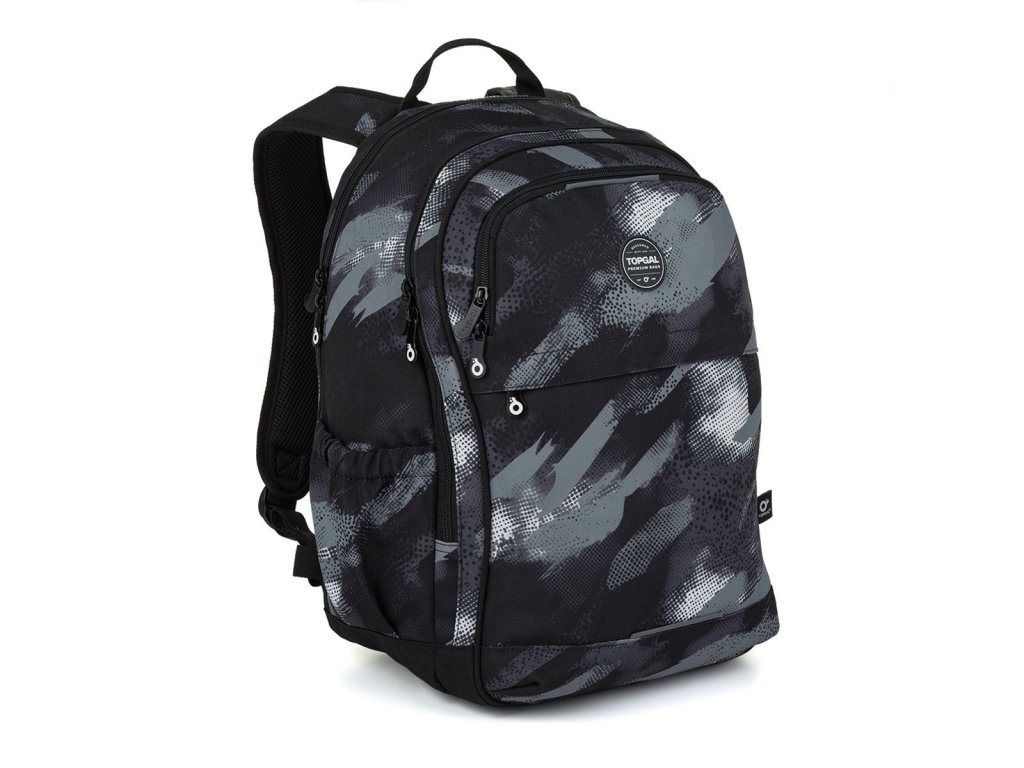 Dvoukomorový studentský batoh v moderním černo-šedém maskáčovém designu o objemu 27 litrů. Nabízí polstrovanou kapsu na 15" notebook, ergonomicky tvarovaná záda z měkké pěny a reflexní prvky pro maximální bezpečnost.