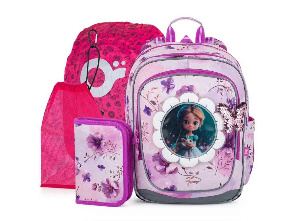 Zvýhodnený set školskej tašky s peračníkom, vrecúškom na prezúvky a nepremokavou pláštenkou.