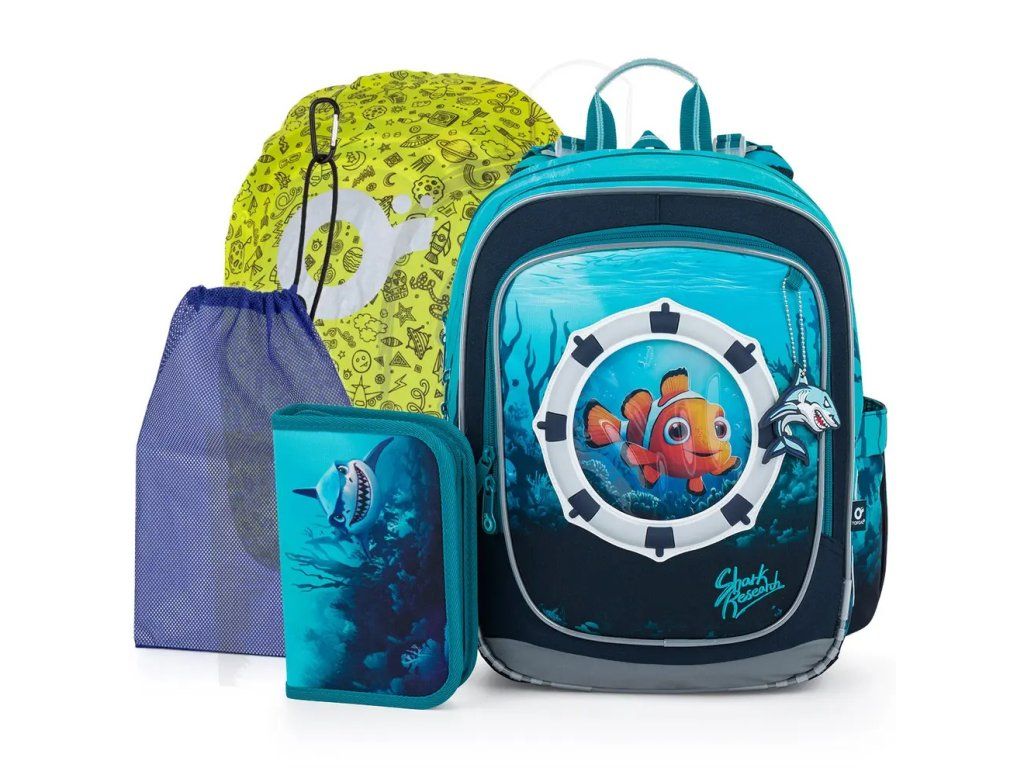 Zvýhodnený set školskej tašky s peračníkom, vrecúškom na prezúvky a nepremokavou pláštenkou.